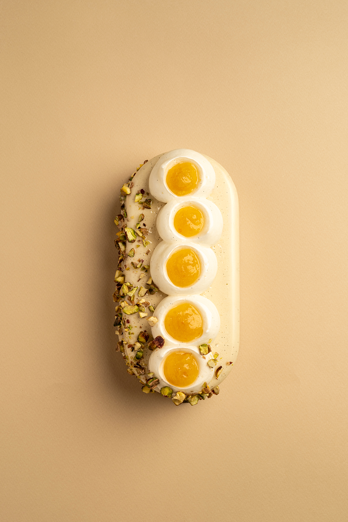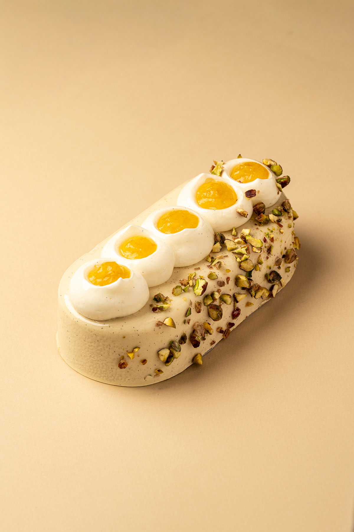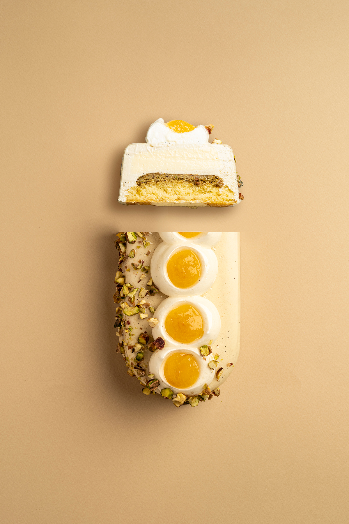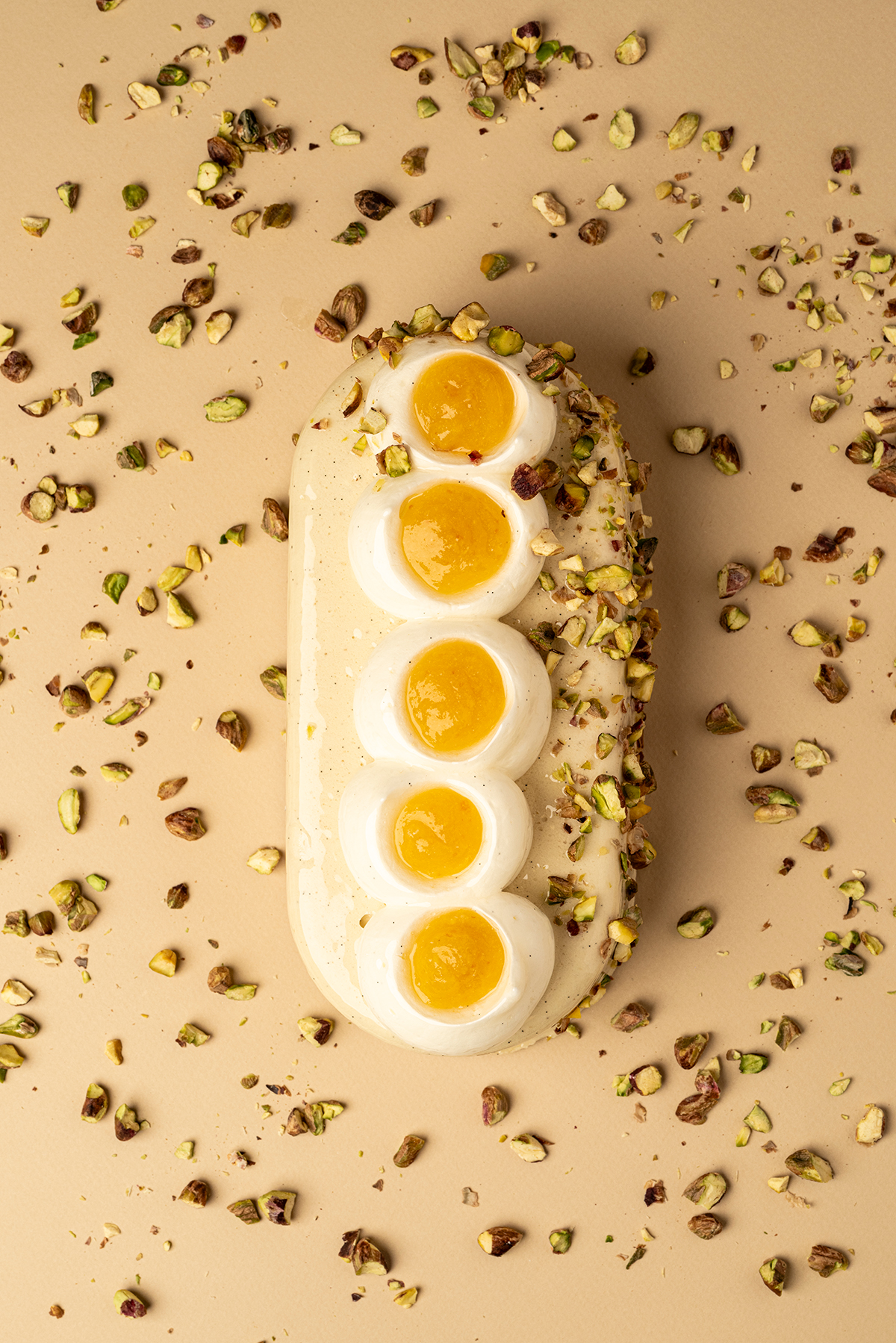 Elle se compose d’un biscuit aux amandes qui sert d’écrin à un crémeux citron vif et délicat, équilibré par une mousse cheesecake à la vanille de Madagascar tout en douceur. Au cœur et sur le dessus, un confit d’agrumes apporte une touche d’acidité rafraichissante, tandis qu’un praliné aux pistaches relève la générosité et la gourmandise de l’île italienne.