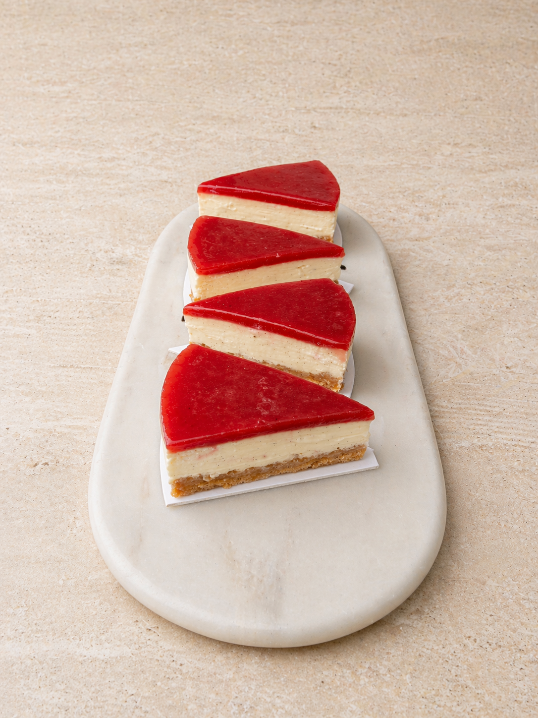 Sur une base croustillante de biscuit repose une crème onctueuse et délicate à la vanille de Madagascar. Le tout est sublimé par un gel brillant à la fraise du Mont du Lyonnais.