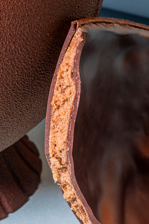 A l’intérieur, une couche généreuse de praliné noisette tapisse le moulage et vient enrichir la dégustation. Elaboré à partir de noisettes soigneusement torréfiées puis finement broyées, ce praliné développe des notes chaleureuses et profondes qui se marient parfaitement avec la puissance aromatique du cacao.
